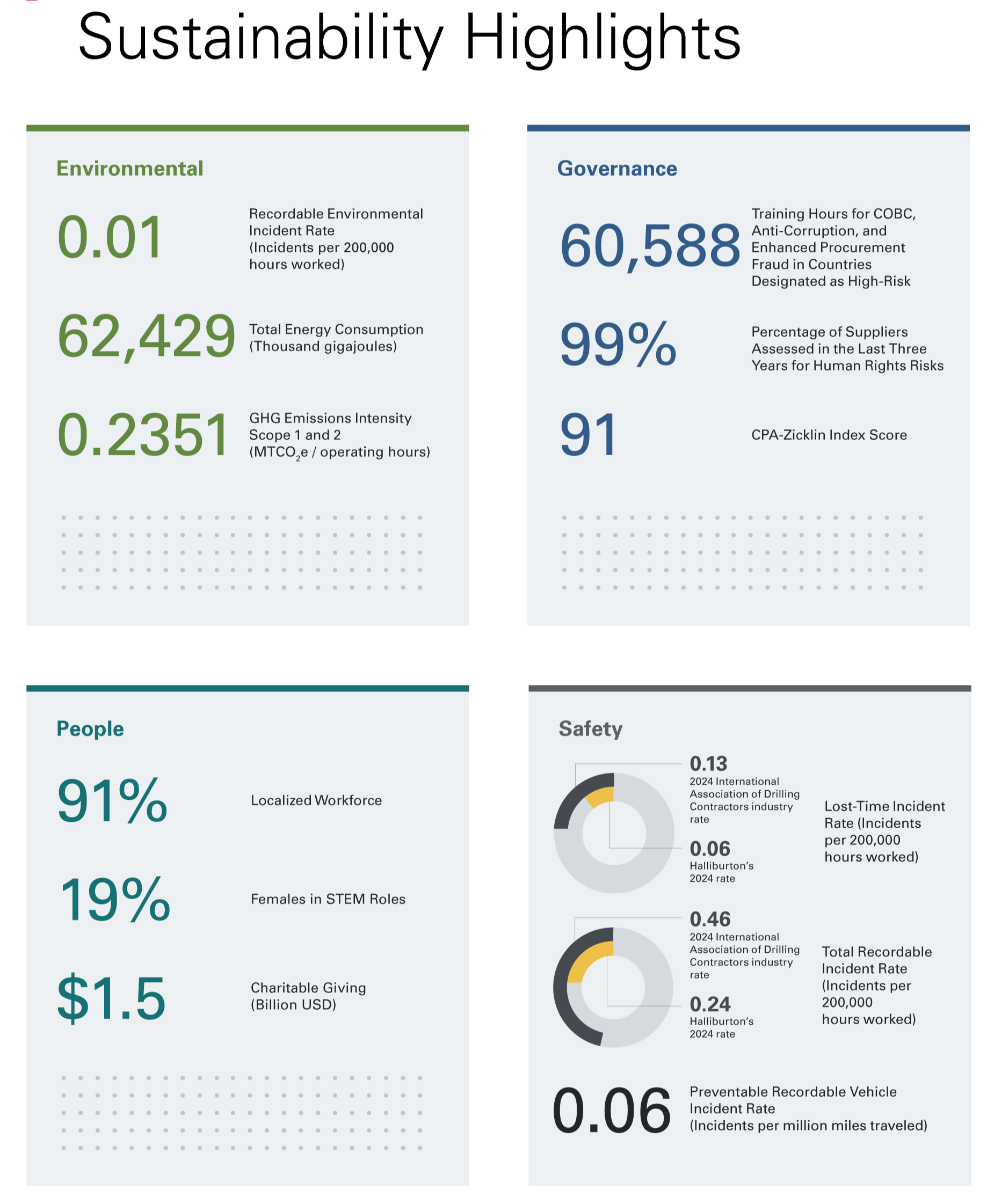 Our 2024 Journey to ZERO efforts included our continued focus on risk management, HSE and SQ culture, and environmental sustainability. We tracked the leadership visits completed each month and focused on fostering quality engagement with critical leadership roles during these visits. We also tracked progress on our GHG emissions, waste, and water activity-based reduction efforts, highlighted in the Environmental section of this report. Halliburton completed 100% of our 2024 Journey to ZERO objectives.